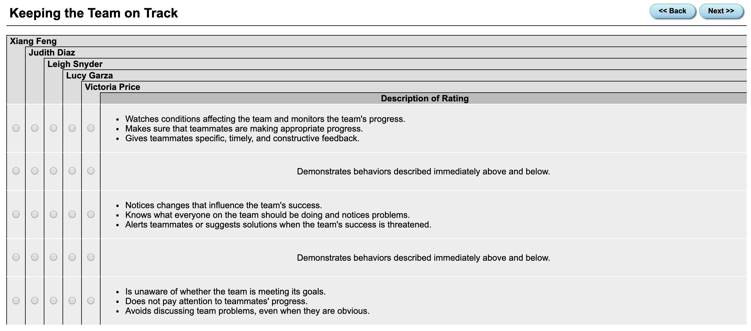 The CATME Rater Practice Program is a game-based rating simulation that provides students the opportunity to practice rating their peers. In this simulation, students are given hypothetical teammates with certain traits to them. These traits represent behaviors that regular teammates could possess. They are then tasked with rating these teammates according to the five CATME Teamwork dimensions. At the end of the simulation, students are given immediate feedback on their ratings and ways to improve their feedback. You can always access a demonstration of Rater Practice.